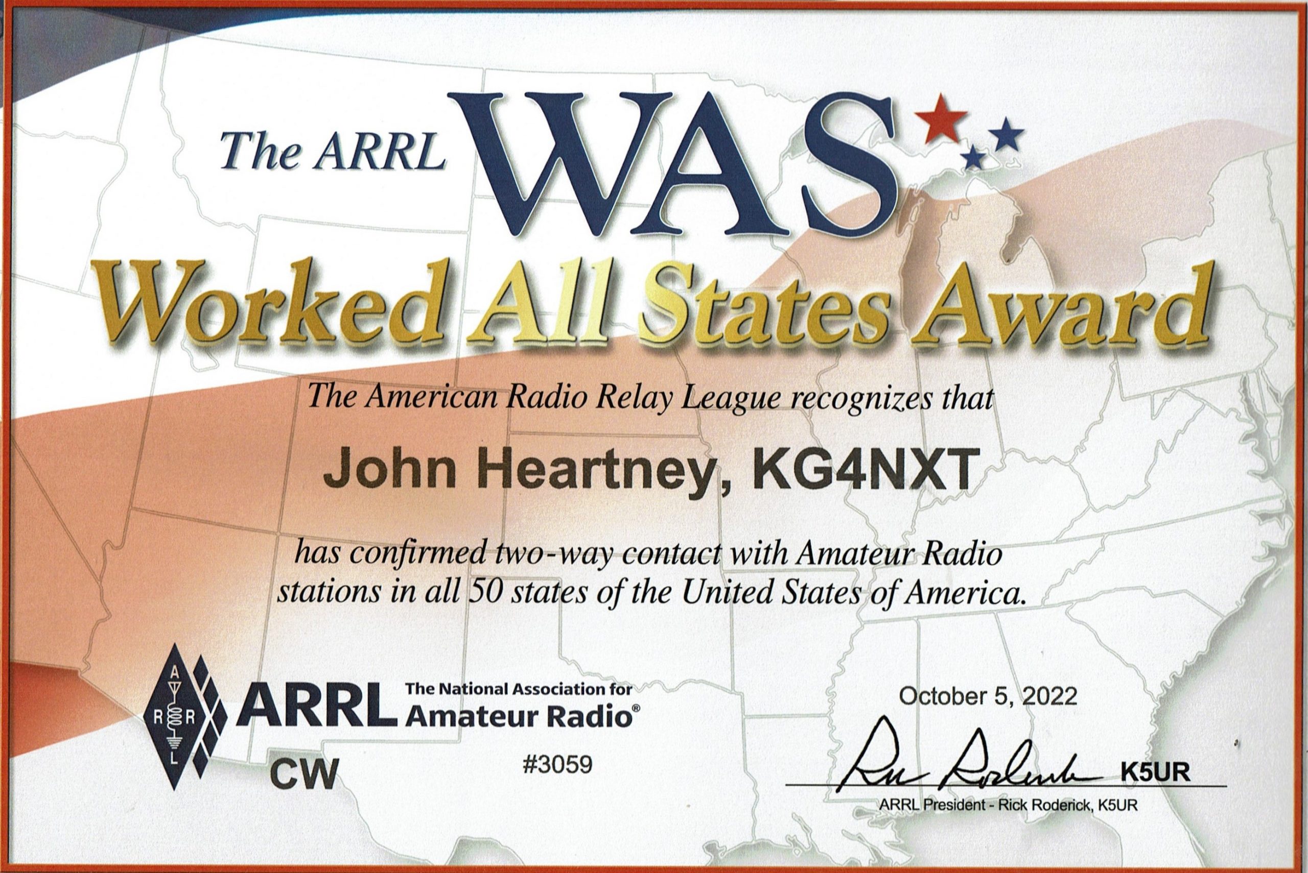 Congratulations to John, KG4NXT on getting his certificate for Worked All States CW. Took a while but he is very proud of this accomplishment.